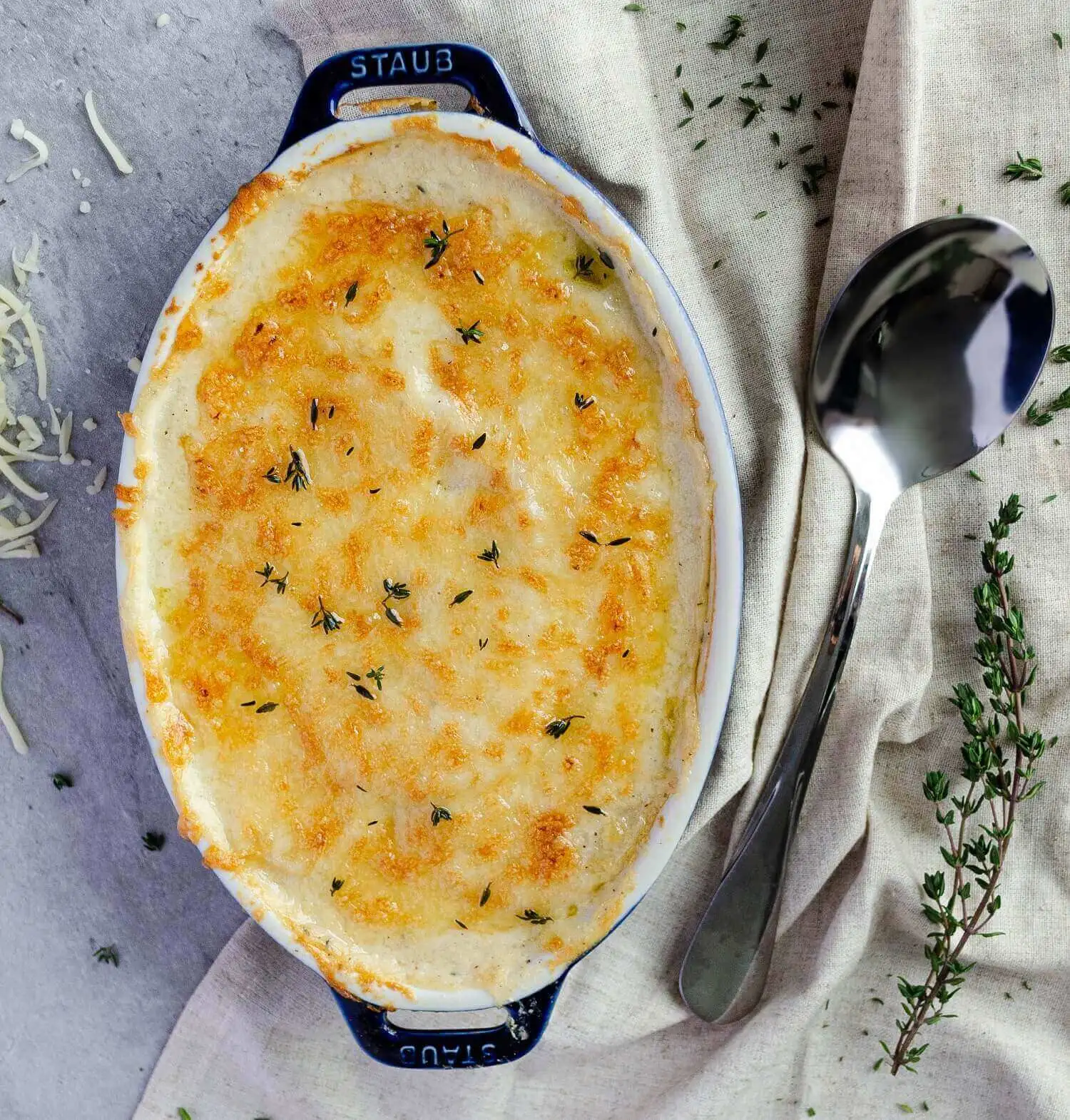 1.预热烤箱至350华氏度。在9英寸的派盘或小砂锅盘中喷洒烹饪喷雾。