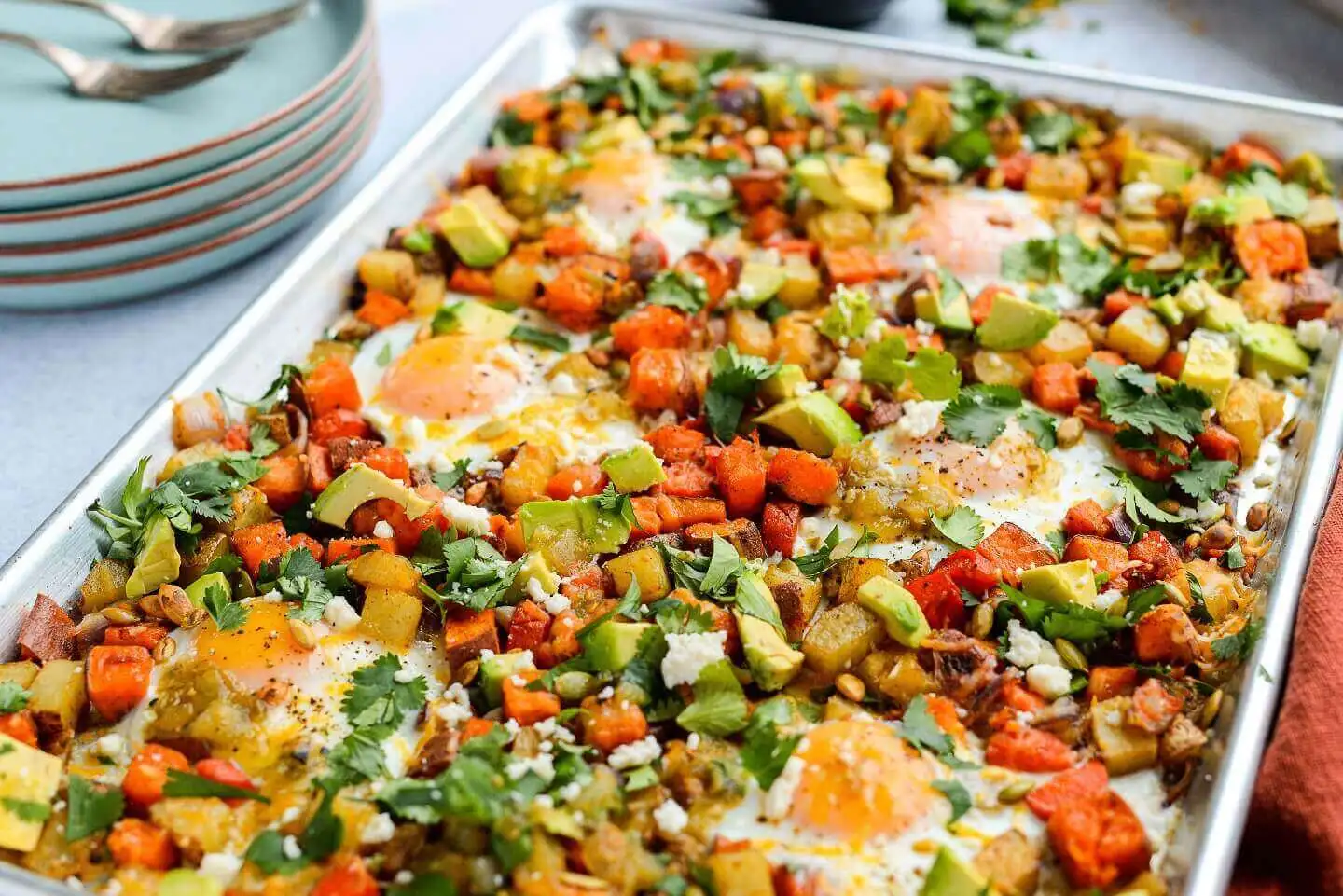 通过制作全包烤,以丰富多彩的方式开始新的一天。阳光明媚的鸡蛋和切碎的植物,就像一张六张阳光从彩虹美食中窥视。Queso Fresco Topping增加了美味的味道。也创建自己的变体 - 天空是极限。