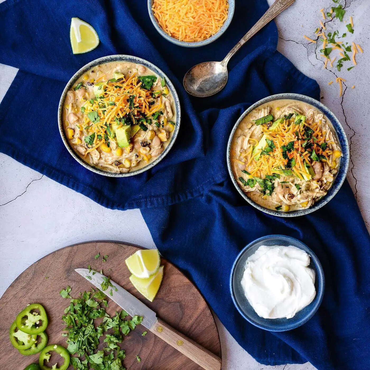 碎切达干酪,切碎的新鲜香菜,希腊酸奶或bob 体育直播 牛油果丁,新鲜的jalapeños,玉米片